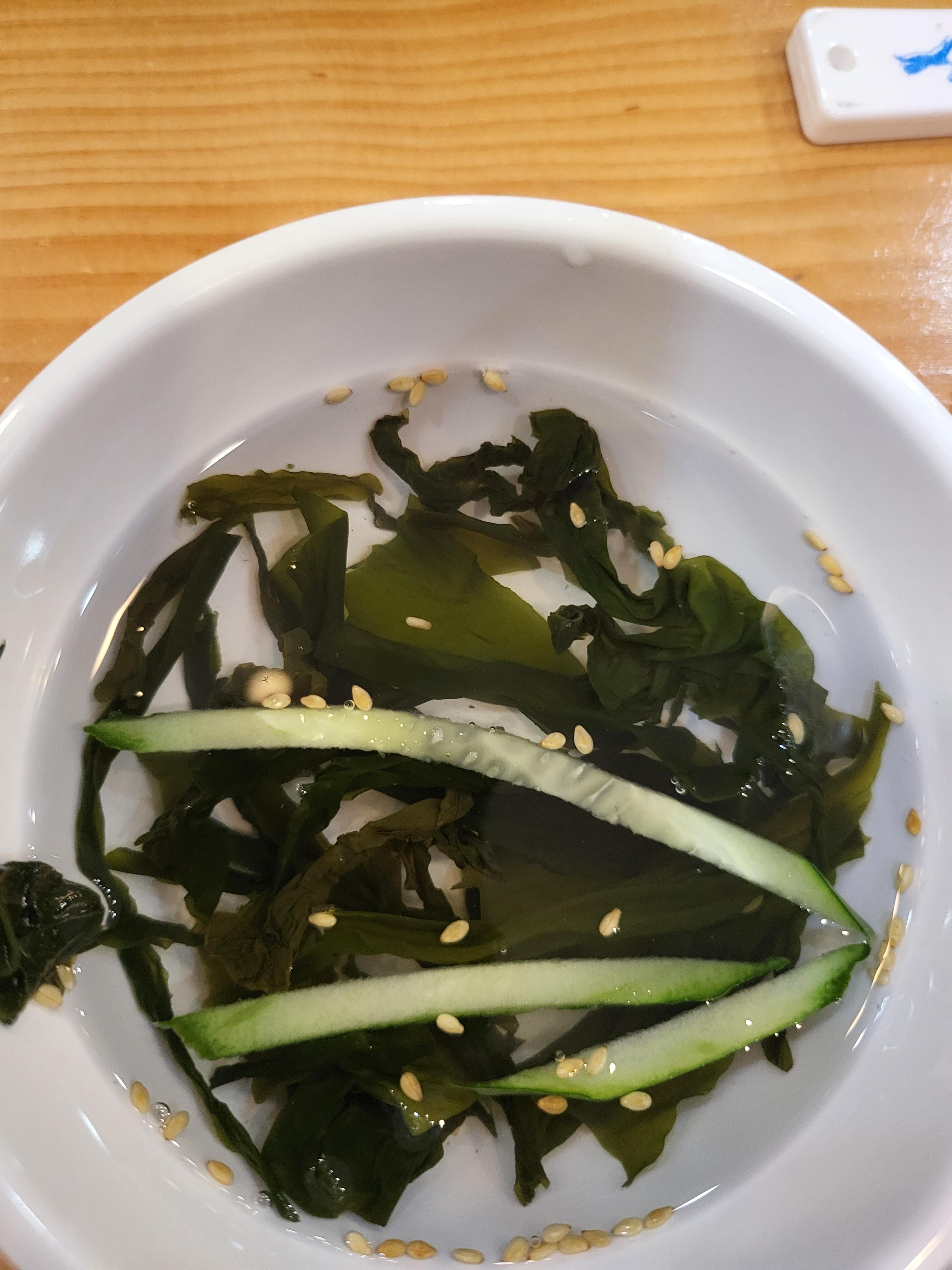 밑반찬으로 콩나물무침 미역냉국 샐러드 순두부 나왔어요.